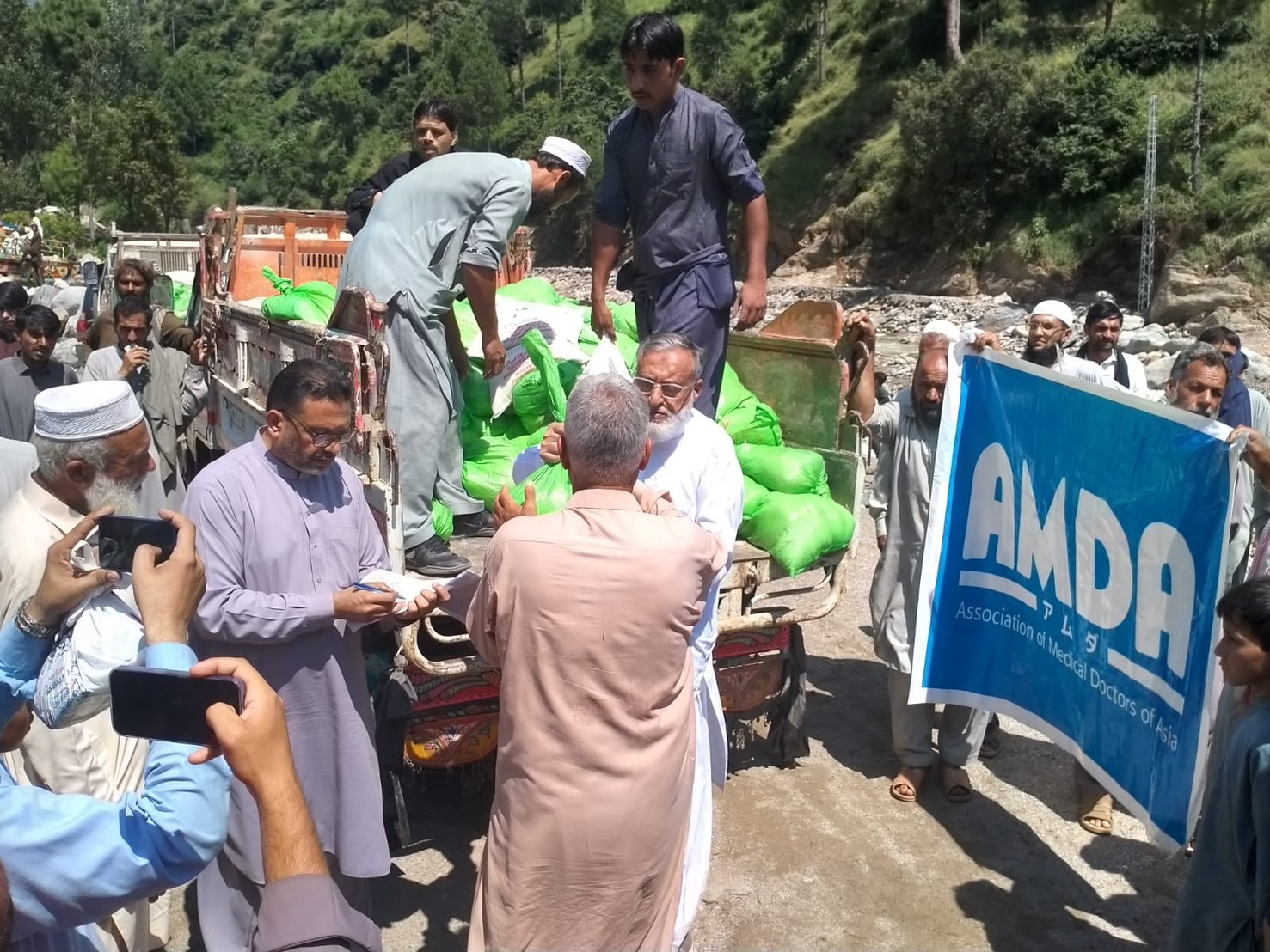 対象地域となったのは被害が深刻だった北西部カイバル・パクトゥンクワ州ブネール県です。AMDAからの支援を含む計800袋の食糧が同県の4ヶ所で配布されました。