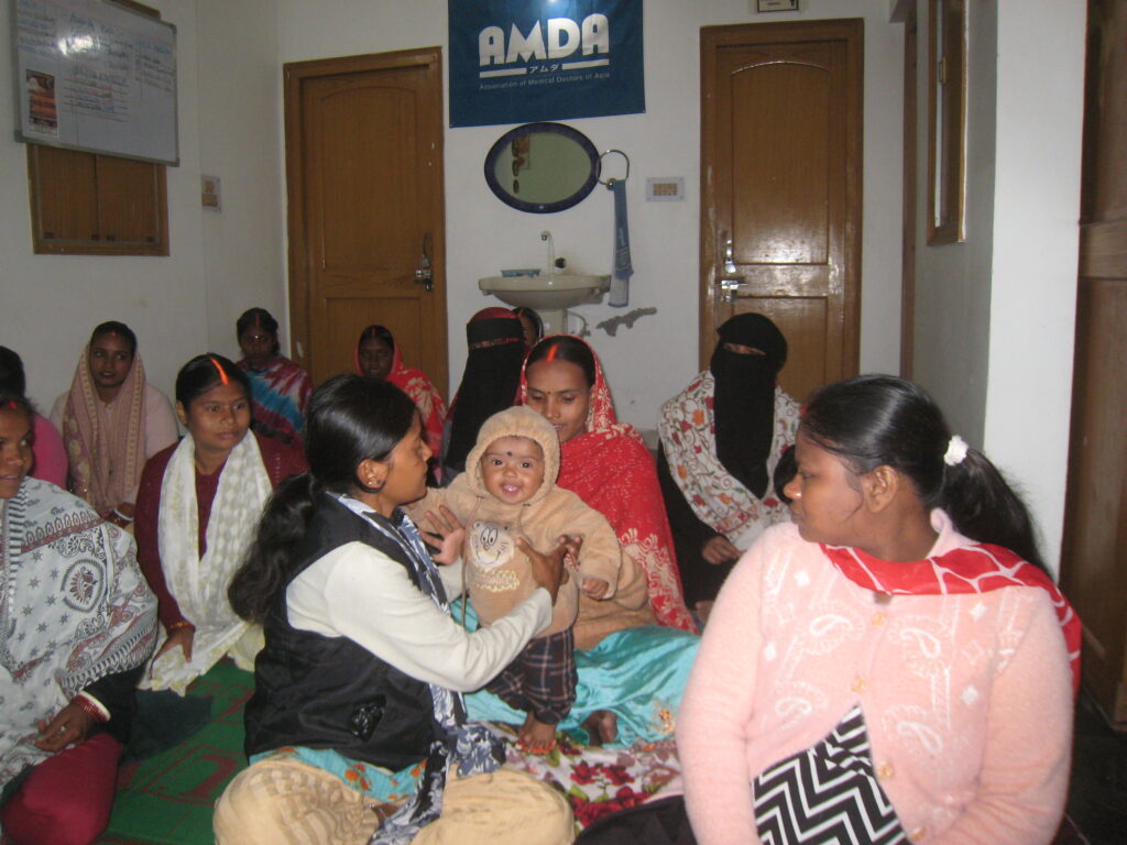 2009年に開院したAMDAピースクリニック(APC)では、2014年より母子保健事業を実施しています。APCの主な活動は、地元医師による月2回の妊産婦健診、毎週水曜日に開催するマタニティクラス(健康教育・栄養プログラム)、そしてAPCスタッフによる妊産婦宅への訪問です。さらに、急変時の連絡対応や困りごとの相談など、ブッダガヤのお母さんに寄り添った支援を続けています。