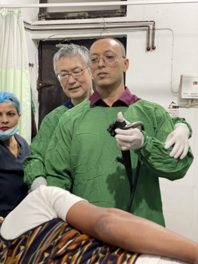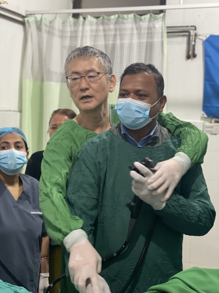 ダマック地域では内視鏡の普及が十分ではない中、これまで上部内視鏡を中心とした研修を実施してきました。地域の患者が地元で検査を受けられる体制が整いつつある一方で、下部内視鏡検査(大腸カメラ)の導入・普及が課題となっていました。こうした状況を踏まえ、2019年11月には台湾衛生省より大腸カメラの寄贈を受け、2023年には第3回目となる現地研修として上部および下部内視鏡の指導を実施しました。