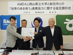 2013年9月10日。総社市、岡山県立大学そしてAMDAの「世界の命を救う!」三者連携の調印式が総社市役所で行われた。対象は災害、福祉、教育・人材育成そして地域振興である。組織のトップの権限は巨大である。