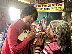 一方、APC の元スタッフが運営する『お年寄りの家』(老人ホーム)には、必要に応じて支援を行っています。今年6 月には、モンスーンの暴風雨で被害を受けた屋根やキッチンなどの修復工事を支援しました。今回の訪問中に、お年寄りや周辺の村の子どもたちにビスケットを配布したりしました。