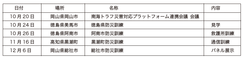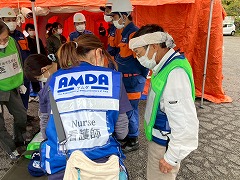 また、協力自治体で開催されている防災訓練にも、AMDA から様々な形で参加させていただきました。10月26 日の徳島県阿南市の防災訓練には、長野県諏訪市から諏訪中央病院の医療チームとAMDA 兵庫が参加し、徳島県美馬市からはホウエツ病院の皆さんがAMDA チームとして参加してくださいました。