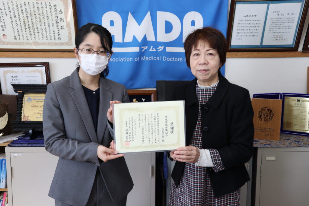 AMDA事務所で行われた贈呈式では、同支部のご担当者の方からは「子どもたちのために少しでも役立ててほしい」とお言葉をいただきました。