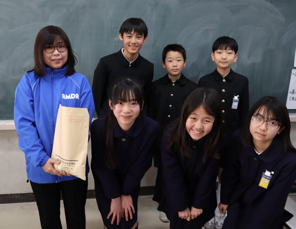 講演後には、6年生の呼びかけにより募金活動を実施していただき集まったご寄付を、6年生の運営委員の皆さんから「AMDAの活動のために使ってください」とお渡しいただきました。
