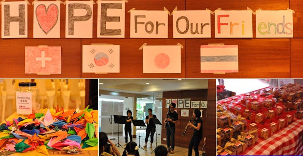 「Hope for our friends」様から募金 2012年1月19日 シンガポール在住の「Hope for our friends」さんがチャリティイベントでの収益金を募金くださいました。 タイの洪水、トルコの地震、そして、まだまだ支援が必要な東日本大震災の復興支援の支援活動に使わせていただきます。 代表、伊藤結子様からのメッセージ: mdaの理念に共感したシンガポールに住む日本人女性が集まり、それぞれが自分にできることを持ち寄って募金を集めました。 少しでも世界各地の被災地の助けになればとの願いを込めました。 よろしくお願いいたします。