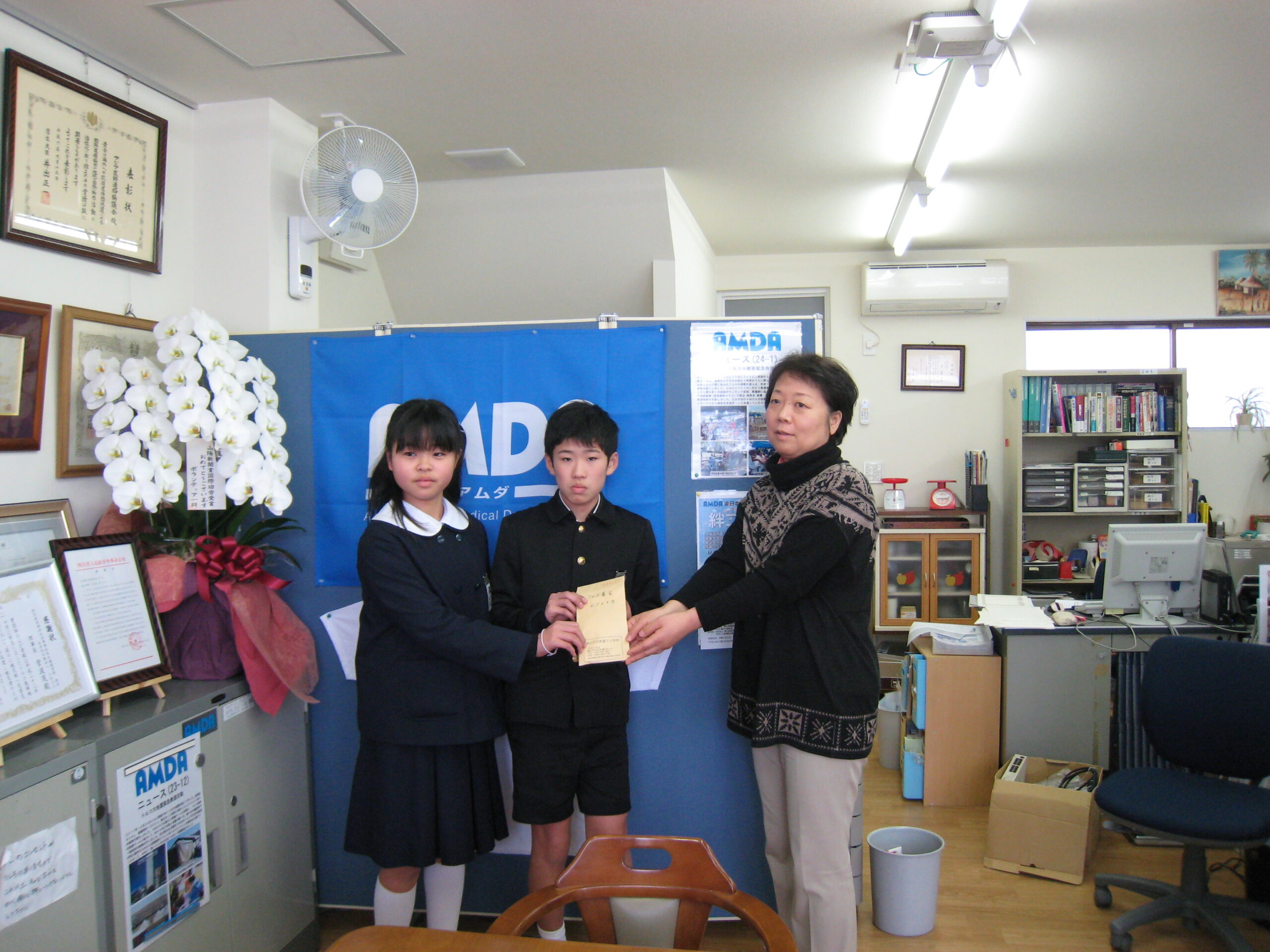 3/8 馬屋下小学校様よりAMDAの活動へのご寄付を頂きました。 メッセージ 全校で集めた募金です。どうぞお役立てください。