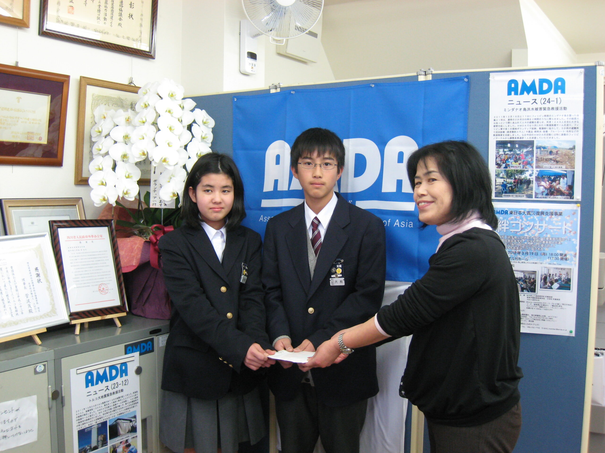 3/8 岡山大学附属中学校様よりAMDAの東日本大震災復興支援に向けてのご寄付を頂きました。