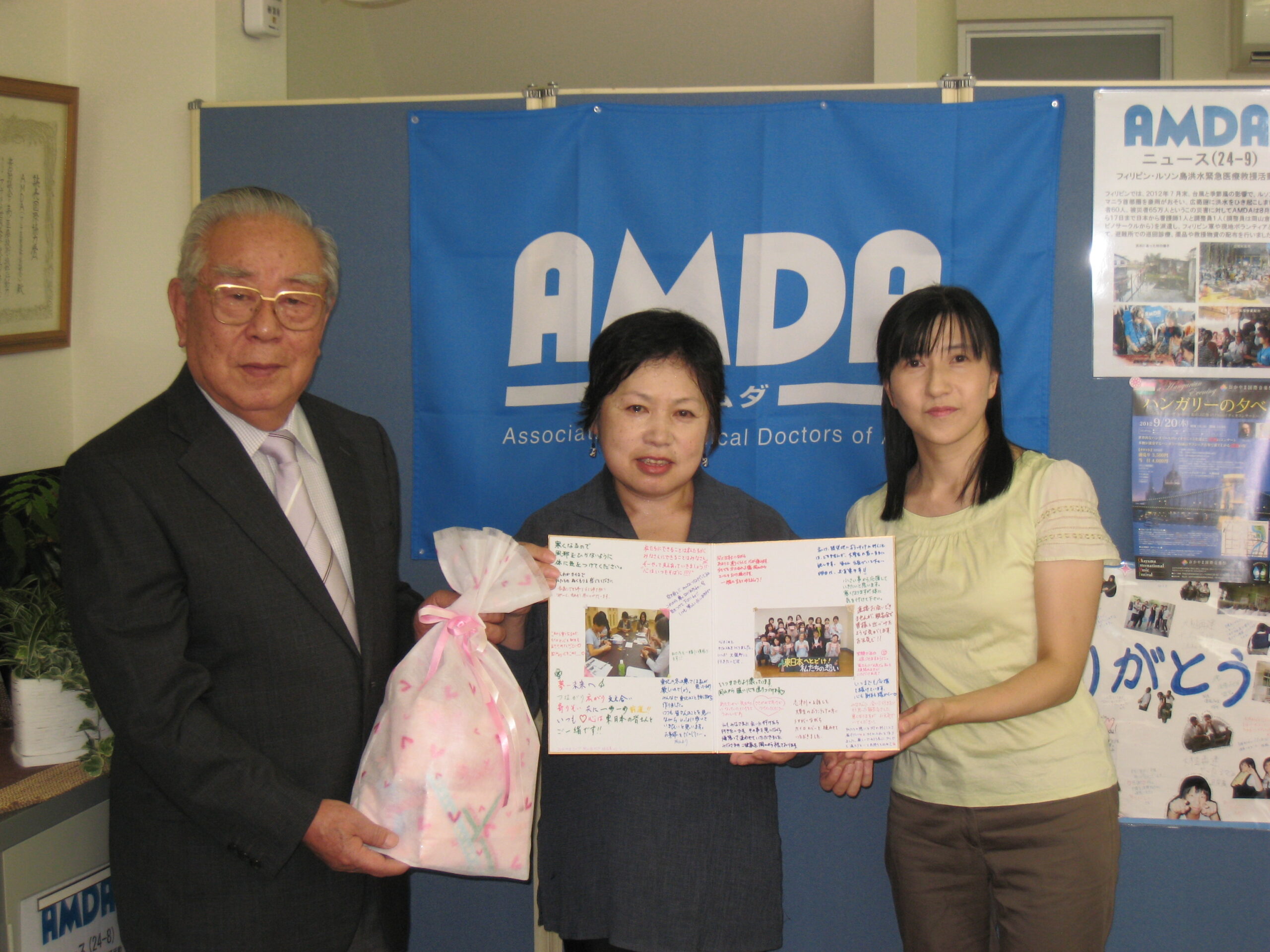 おかやまコープ岡山西エリア ピースアクション実行委員会様より贈呈 2012年9月21日 9月21日 おかやまコープ岡山西エリア ピースアクション実行委員会様より寄せ書き色紙、写真、カイロ袋25個を贈呈頂きました。 被災地に届けさせて頂きます。 メッセージ: 仮設住宅を訪問された方のお話を聞き、被災地の現状を知り、離れた岡山の地でも忘れずに被災地の方々のことを想っているというその想いを形にしたいと、カイロ入れを心を込めてひと針ひと針縫いました