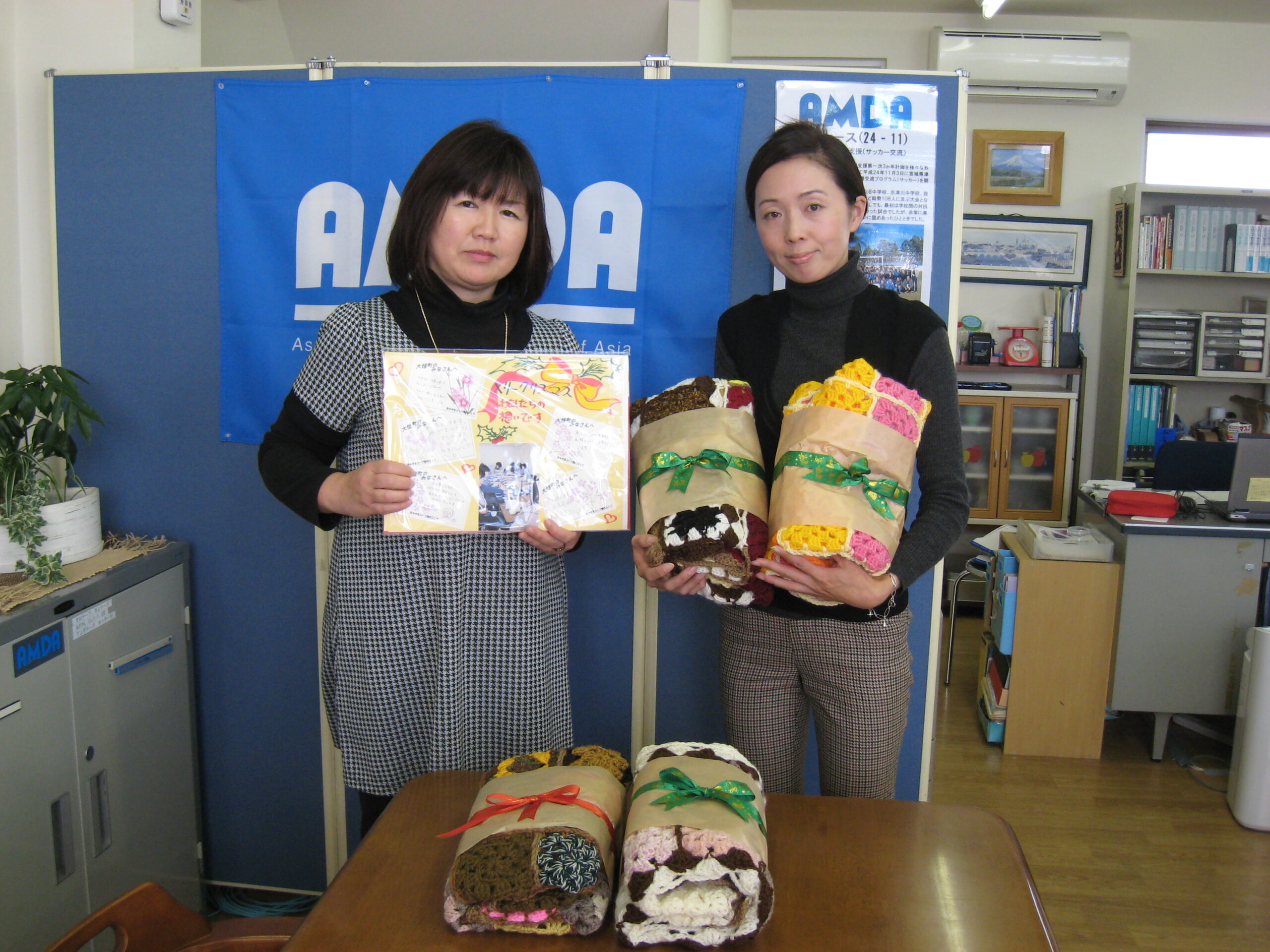 おかやまコープ美作エリア様からひざ掛けのご寄付 2012年12月7日 12月6日 おかやまコープ美作エリア様から手編みのひざ掛けのご寄付を頂きました。組合員の皆様で作成されたものです。東日本大震災の被災者の方にお送りいたします。 メッセージ:東北の冬は本当に冷たく寒いと思いますが沢山の方のみなさんを思う気持ちを込めたひざ掛けで温かくお過ごしいただけたらと思います。