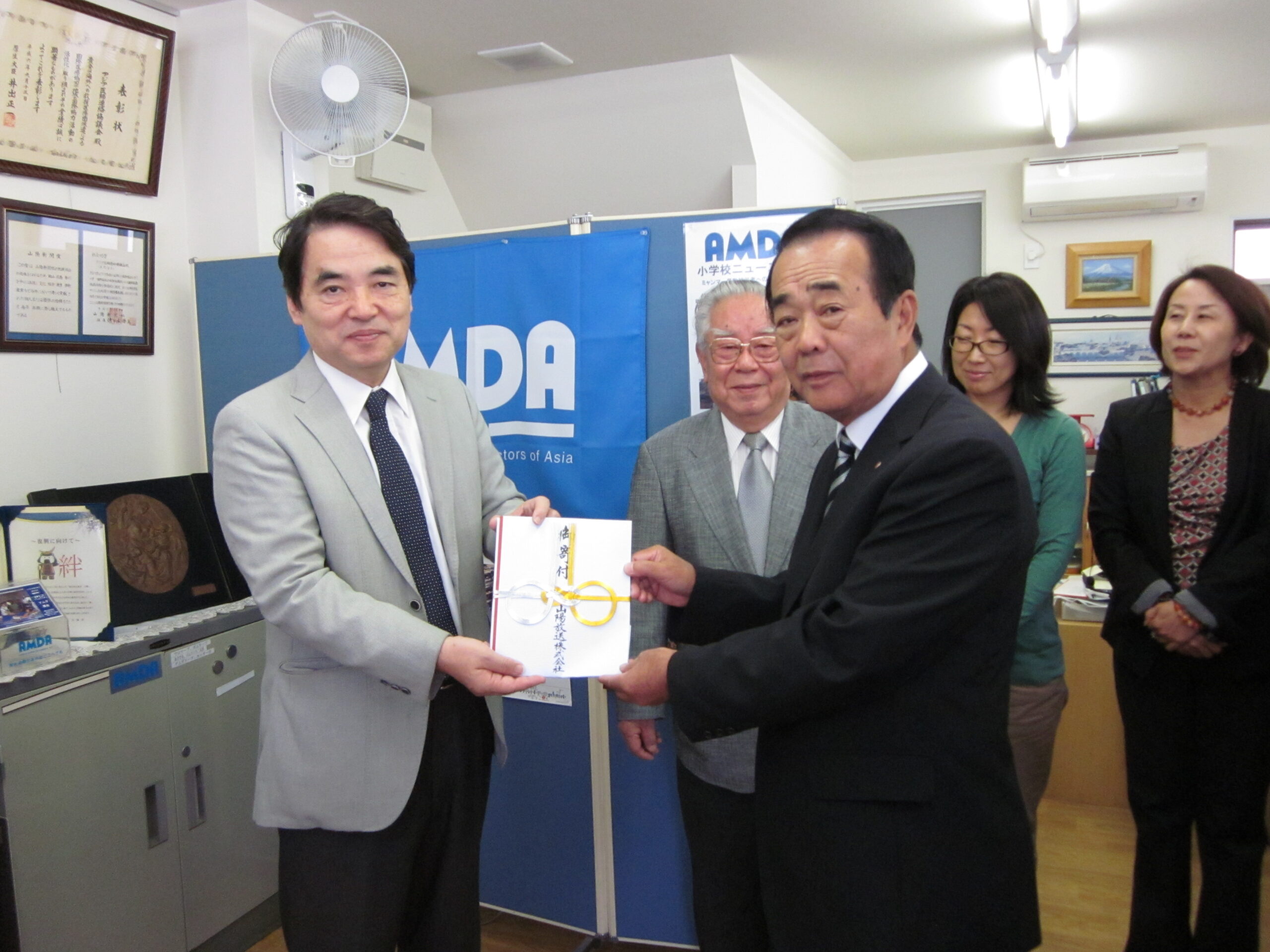 山陽放送株式会社様よりご寄付 2013年10月18日 山陽放送株式会社様よりご寄付 10月18日、山陽放送株式会社代表取締役社長 原憲一氏からご寄付を頂きました。これは9月22日に開催された「もっと知ろう!ESDトーク&チャリティーコンサート」において、来場者から委託された浄財及び社内外から寄託された浄財とを合わせAMDAの活動へご寄付頂きました。メッセージ:今後とも国内外の緊急時における救済活動でのご活躍に期待しております。