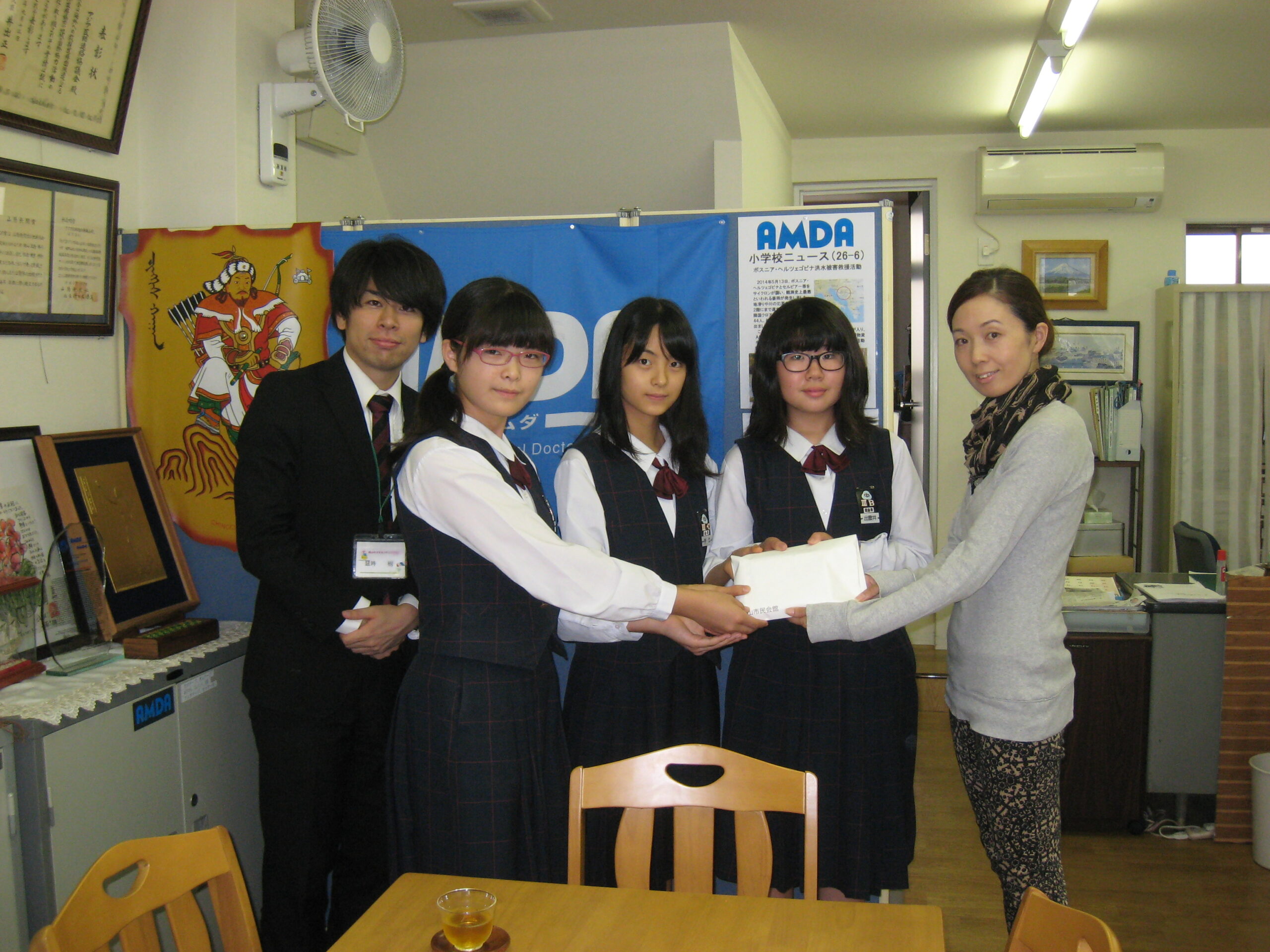 香和中学校 生徒会様よりご寄付 2014年10月14日 香和中学校 生徒会様よりご寄付 2014年10月9日、香和中学校の生徒会の方が中心となって使用済みハガキを集めてくださり、ご寄付として事務所にお持ちくださいました。 メッセージ:生徒全員で社会に貢献できるような活動がしたいと思い 今回、書き損じはがきを集めることにしました。これからもこのような活動を続けていこうと思います。