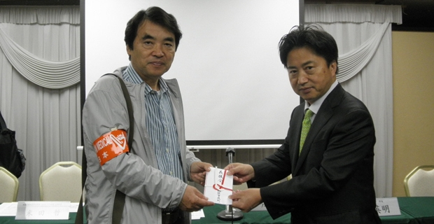4月30日、第3次医療チーム出発前の記者会見の場で、総社市職員有志の方からのご寄附を総社市 片岡市長から贈呈いただきました。