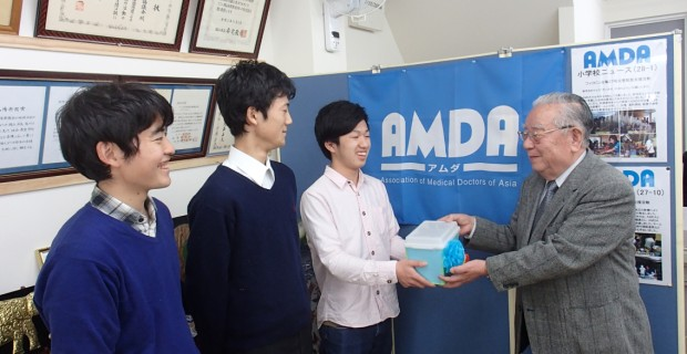 実行委員3名はAMDA本部にて、AMDAボランティアセンター長である小池に募金箱を渡しました。