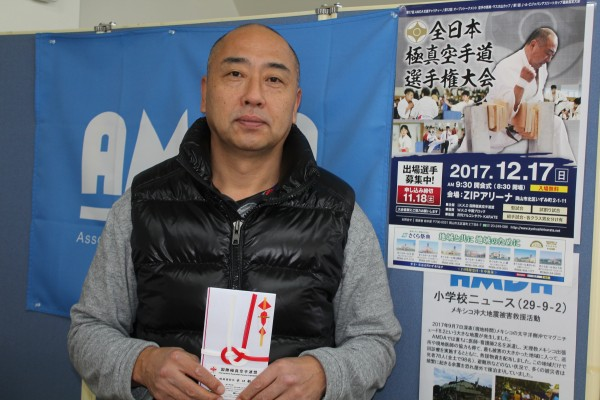 極真会水口道場様からご寄付を頂きました 2017年11月16日 極真会水口道場(岡山市北区富町)の水口敏夫師範(8段)から11月16日、AMDAにご寄付を頂きました。 水口師範は約30年前、AMDA創設者の菅波茂氏と知り合い「まじめで誠実な人柄にひかれた」とAMDAへの支援を続けてもらっています。寄付は12回目。「地方都市の岡山から海外へ医療支援を続けるAMDAに共鳴している。頑張って」とエールを送って頂きました。 水口師範は大学時代から本格的な空手修行を始め、国内外の数々の大会で優秀な成績を修め、世界各地で技術指導や演武会に参加されています。
