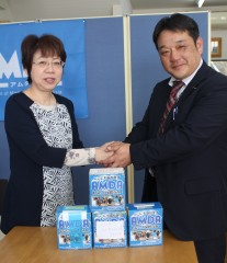 岡山支店チームGIFTの古谷野圭二主任がAMDA本部(岡山市北区伊福町)を訪ねて頂き、「国内外の災害、紛争地にいち早く駆けつけられる姿をメディアで拝見しています。岡山の誇りです」と話し、難波比加理理事に募金箱を手渡しました。