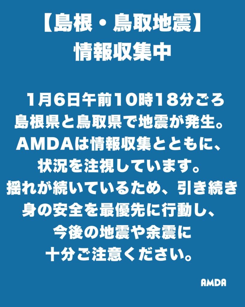 1月6日午前10時18分ごろ、最大震度5強の地震が島根県と鳥取県で発生しました。 2026年1月6日 AMDAは情報収集とともに、状況を注視しています。 揺れが続いているため、引き続き身の安全を最優先に行動し、今後の地震や余震に十分ご注意ください。